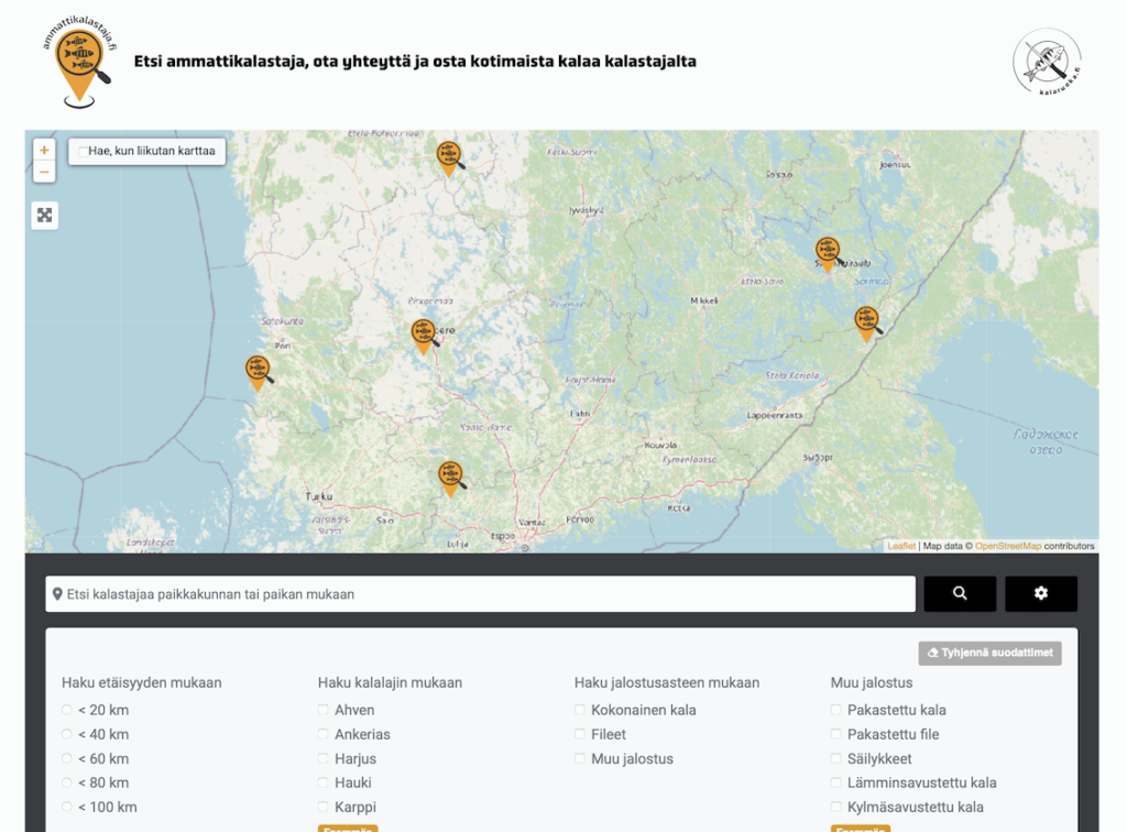 Ammattikalastaja.fi on karttapalvelu, jonka avulla kuluttaja löytää helposti lähialueensa ammattikalastajat ja heidän yhteystietonsa. Nappia painamalla hän voi olla kalastajaan yhteydessä ja ostaa tuoretta kalaa suoraan sinulta eli ammattikalastajalta – ilman välikäsiä.